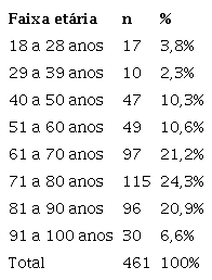 Quanto à faixa etária, ocorreu um predomínio entre as idades de 61 a 90 anos, com um quantitativo maior entre 71 a 80 anos com 105 (24,3%), em seguida os pacientes entre 61 e 70 anos com 97 (21,2%), conforme a Tabela 1.