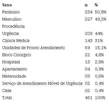 Ao analisar a Tabela 2, houve um predomínio do sexo feminino com 234 mulheres (50,8%). Já no tocante a procedência, a maioria dos pacientes foram provenientes da urgência com 200 (43,4%), em seguida os da clínica médica com 141 (30,6%), Unidades de Pronto Atendimento (UPAS) 69 (15%), bloco cirúrgico 22 (4,8%) e de outros hospitais apenas 13 (2,8%).