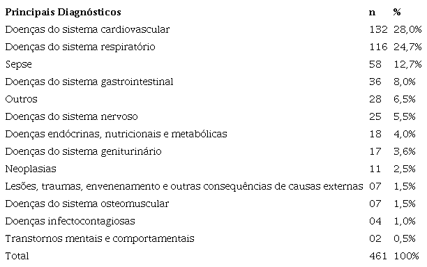 Foi observado uma prevalência das doenças cardiovasculares comprometendo um total de 132 pacientes (28,0%), onde os principais agravos foram o acidente vascular encefálico (AVE) e insuficiência cardíaca congestiva (ICC), em seguida estão as doenças do sistema respiratório com ênfase para a insuficiência respiratória aguda (IRPA) e doença pulmonar obstrutiva crônica (DPOC) que atingiu 116 pacientes (24,7%).