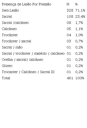 Em relação à presença de lesão por pressão, foi identificada a ausência de lesão por pressão em 328 (71,1%) pacientes, em contrapartida 108 (23,4%) já apresentavam lesão sobretudo na região sacral conforme a Tabela 4.