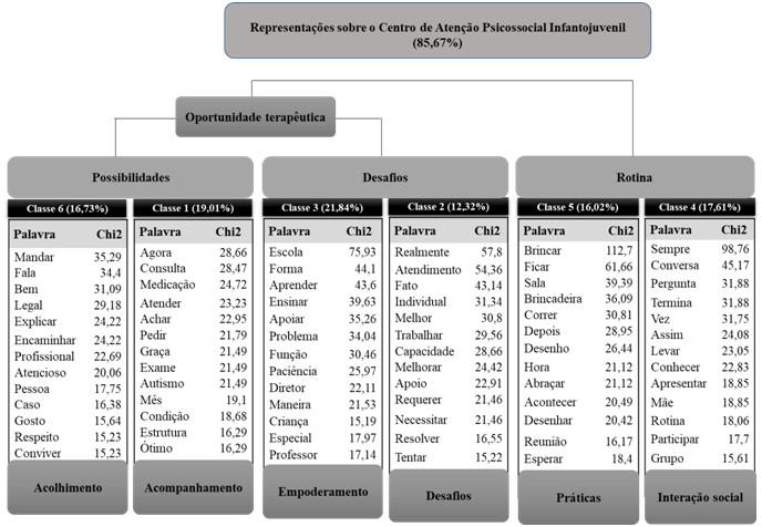 Na classe 1, a qual totalizou 19,1% das UCE, as palavras de maior expressão foram: agora, consulta, medicação, atender, achar, pedir, graça, exame, autismo, mês, condição, estrutura e ótimo. Esta classe corrobora que as representações sociais acerca do CAPSij o conectam à porta de entrada para o início do acompanhamento, com possibilidade de acesso a outros serviços no âmbito do SUS, quando isto se fizer necessário.