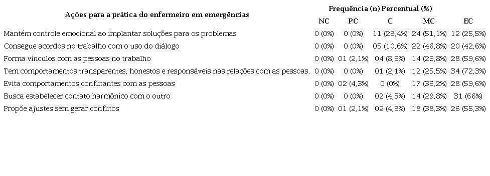 Nessa direção, os enfermeiros se autoavaliaram no domínio ''Relações no trabalho'' como ''muito competente'' ou ''extremamente competente'' em todas as ações como descrito na tabela 1.