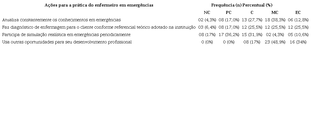 No domínio ''Prática profissional'', os enfermeiros se autoavaliaram de maneira positiva registraram emissões de ''muito competente'' ou ''extremamente competente'' em todas as ações de acordo com a tabela 2.