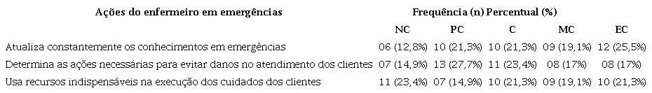 Methods: This was a quantitative, descriptive and cross-sectional study developed with 47 nurses who work in four areas of the trauma unit of a public hospital in the Northeast of Brazil. A validated Likert Scale questionnaire was applied to evaluate the professional competence of nurses during emergencies; this scale included sociodemographic variables, professional training, a fictitious case, and a self-assessment of daily activities related to the reality of work. The data collection was carried out from July to September 2019. To analyze the data, the researchers employed descriptive statistics or the SPSS software and a qui-square test to verify the significance using a p value of <0.05.