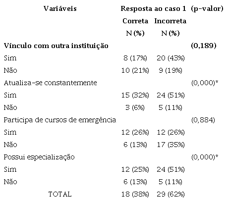 Em relação a tabela 5 é possível verificar a associação de variáveis trabalhistas e de formação profissional em relação a resposta correta ao estudo fictício, nesse sentido obtém-se significância estatística nas variáveis ''atualiza-se constantemente'' e ''possuir especialização em áreas diversas''. Cabe inferir que apesar dos participantes afirmarem a prática de atualização constante e possuir de algum tipo de especialização o índice de resposta incorreta foi elevado entre eles. (Tabela 5)