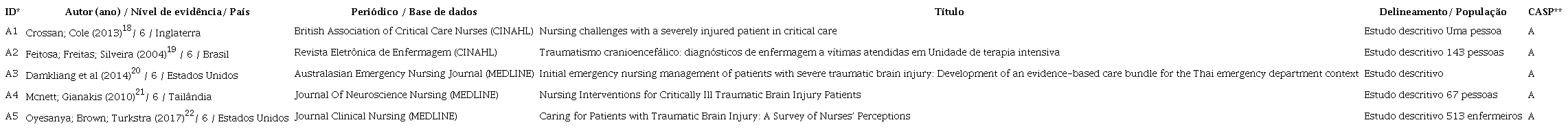 Como limitações à revisão, apresenta-se a lacuna na literatura da quantidade de estudos que relacionem o processo de enfermagem aos cuidados com o traumatismo cranioencefálico.