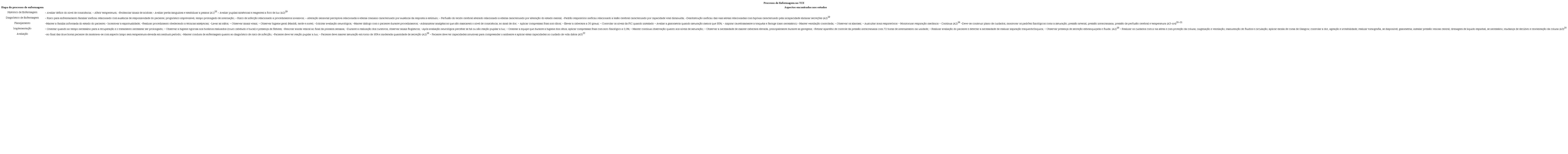 A sistematização das evidências encontradas nos estudos da amostra está disposta no quadro 2. Diante dos achados envolvendo o processo de enfermagem no TCE pautou-se a organização dos dados conforme as cinco etapas do processo de enfermagem, a saber: Histórico, Diagnóstico, Planejamento, Implementação e Avaliação. Destaca-se que estas fases são interdependentes, inter- relacionadas e recorrentes.