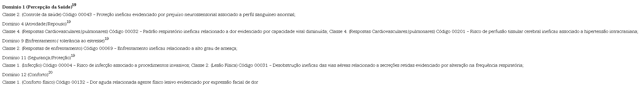 Nesse sentido, aplica-se ainda a este processo a capacidade de julgamento clínico a partir das respostas humanas que culminam no diagnóstico de enfermagem. O uso de linguagens padronizadas ou taxonomias melhora a comunicação entre os profissionais de enfermagem, em todo o mundo, ao padronizar a linguagem profissional. No caso da NANDA-I, além de padronizar, existe o benefício de uma classificação10. Nas vítimas de TCE, a linguagem mais utilizada é a NANDA-I, sendo possível avaliar e julgar padrões relacionados a regulação neurológica, eletrolítica, térmica, oxigenação, integridade cutânea-mucosa, integridade física e mecânica e os mecanismos sanguíneos11.