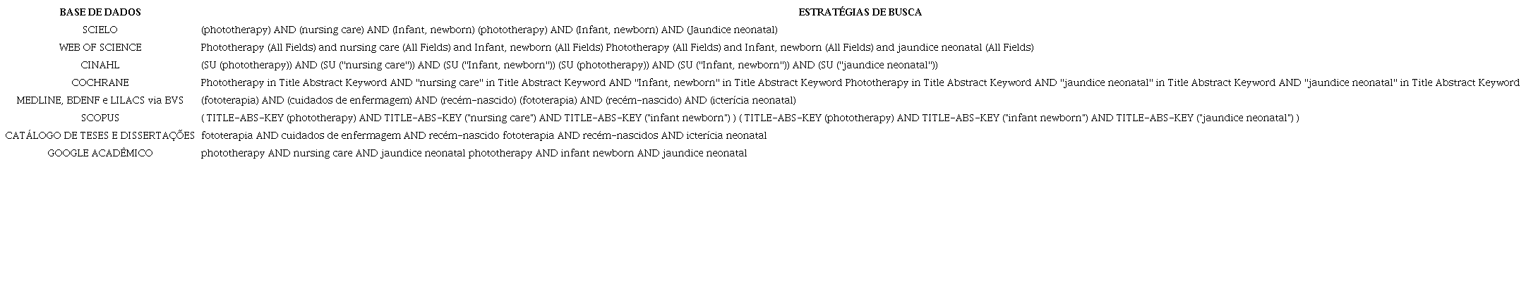 Para tal, serão considerados os descritores controlados em inglês e português, indexados no Health Science Descriptors/Medical Subject Headings (DeCS/MeSH): ''recém-nascido/infant newborn'', ''fototerapia/phototherapy'', ''icterícia neonatal/ jaundice neonatal'' e ''cuidados de enfermagem/nursing care''. Será utilizado o operador booleano AND para realização dos cruzamentos entre os descritores para uma busca não controlada. Ressalta-se que serão realizadas duas estratégias de busca por base, sendo uma com abordagem dos descritores fototerapia, cuidados de enfermagem e recém-nascido e a outra com fototerapia, recém-nascido e icterícia neonatal, conforme descrito no Quadro I.