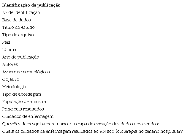 Destarte, o objetivo do estudo constitui-se em mapear a produção do conhecimento sobre os principais cuidados de enfermagem realizados aos RN submetidos a fototerapia em unidades neonatais. Mais especificamente, esta revisão pretende responder a seguinte questão: Quais os cuidados de enfermagem realizados ao RN sob fototerapia no cenário mundial?