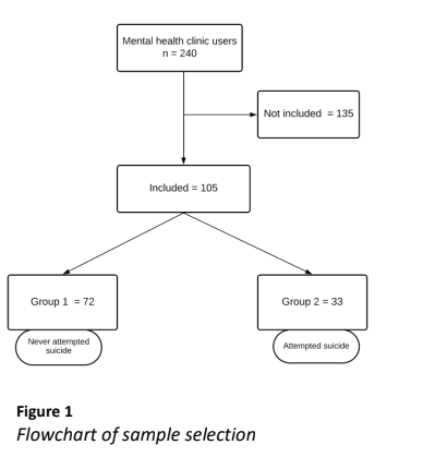 The individuals in outpatient treatment during the collection period were 240. From this total, 135 could not be reached in therapy because they did not come to the health unit during the data collection period. Thus, the sample consisted of 105 subjects divided into two groups, group 1 consisting of participants who had never attempted suicide 72 (68.6%) and group 2 with individuals who had attempted suicide at least once 33 (31.4%) (Figure 1).