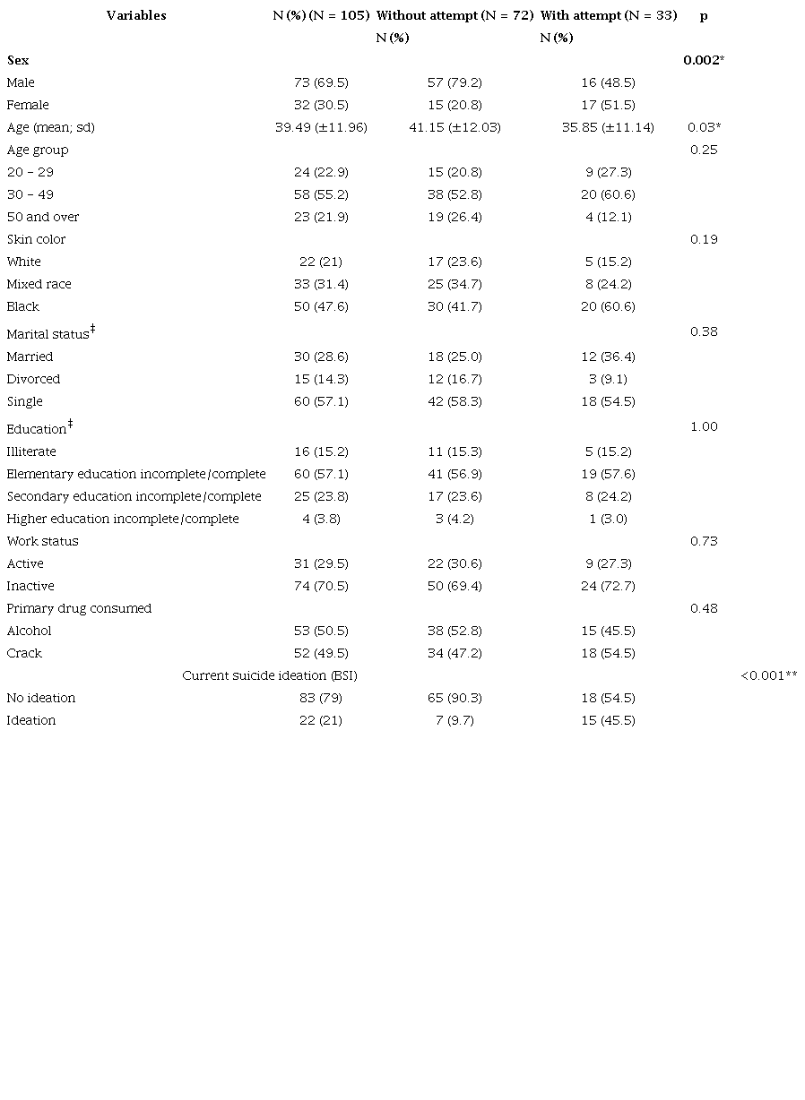 Compared with those who had no history of attempted suicide, the participants that had attempted suicide (group 2) included a higher proportion of women (χ2(1) = 10.05; p=0.002) and were younger (χ2(2) = 2.76; p=0.25), with an average age of 35.85 (±11.14), significantly different between the two groups (t (103) = 2.14; p=0.03). In both groups, there was a predominance of black people (χ2(2) = 3.26; p=0.19), singles (χ2(2) = 1.89; p=0.38), with low levels of education (χ2(3) = 0.19; p=1.00) and unemployed (χ2(1) = 0.11; p=0.73). (Table 1).
