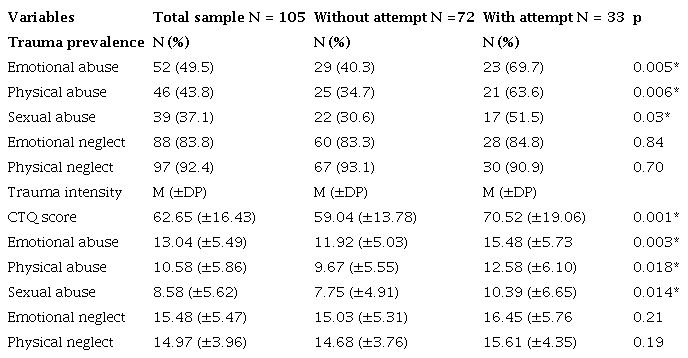 Resultados: Da amostra analisada, 33 (31,4%) já haviam tentado suicídio e tiveram exposição significativamente maior a abusos emocionais, físicos e sexuais (p <0,05) em comparação com os participantes que nunca tentaram suicídio.