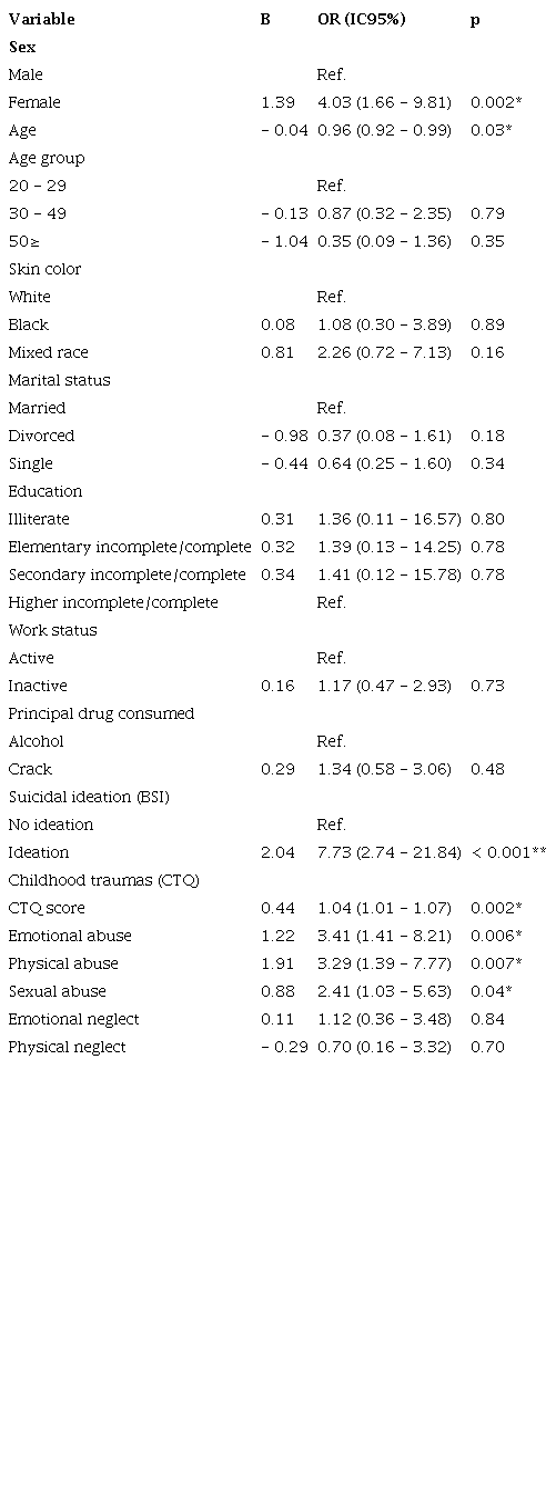 The univariate logistic regression analyses were performed considering the sociodemographic factors and those related to childhood stress subtypes in order to identify the different types of variables that predict previous suicide attempts. According to the regression, female patients are 4.03 times more likely to attempt suicide when compared to male patients (OR = 4.03; CI 95% = 1.66-9.81; p=0.002). The age was a protective factor for suicide attempts (OR = 0.96; CI 95% = 0.92-0.99; p=0.03). Among participants with suicidal ideation, the prevalence of attempted suicide is seven times higher than that of the group that did not have suicidal ideation (OR = 7.73; CI 95% = 2.74-21.84; p< 0.001).