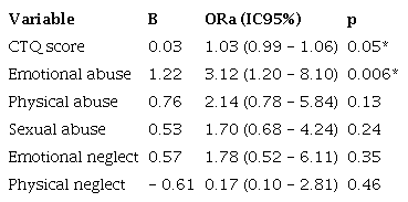 The significant predictors of suicide attempts were the total CTQ score (OR = 1.04; CI 95% = 1.01-1.07; p=0.002) EA (OR = 3.41; CI 95% = 1.41-8.21; p=0.006), PA (OR = 3.29; CI 95% = 1.39-7.77; p=0.007) and SA (OR = 2.41; CI 95% = 1.03-5.63; p=0.04) that increased the risk for suicide attempt (Table 3).