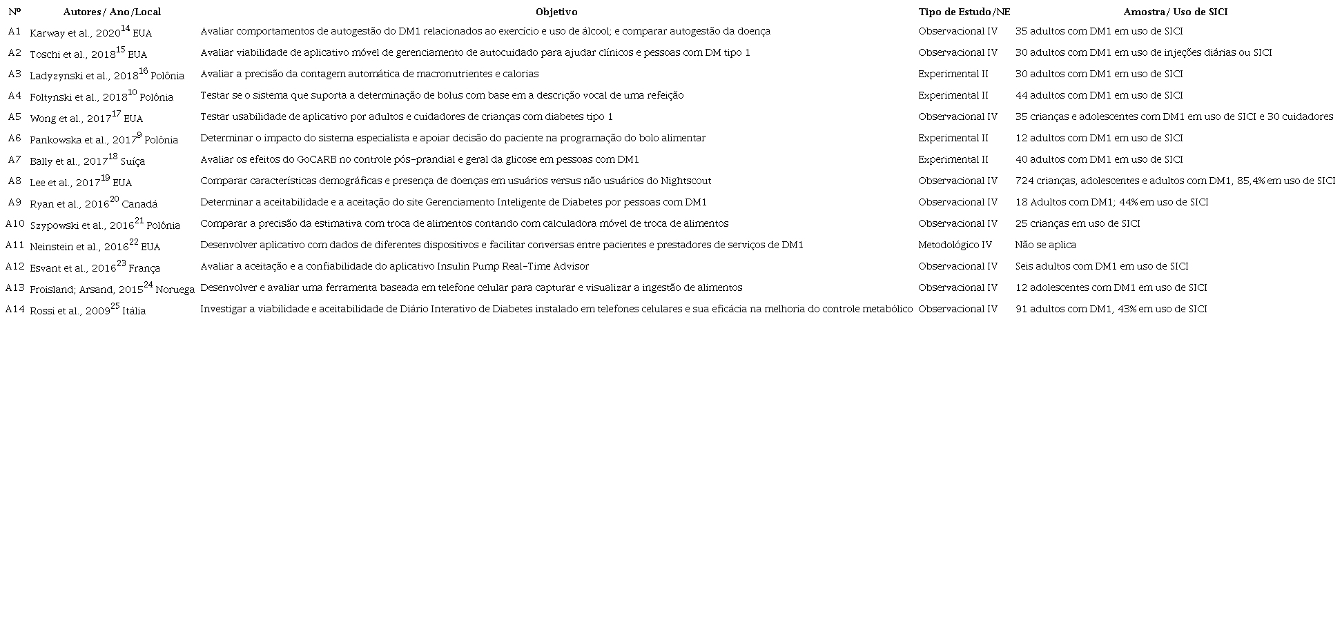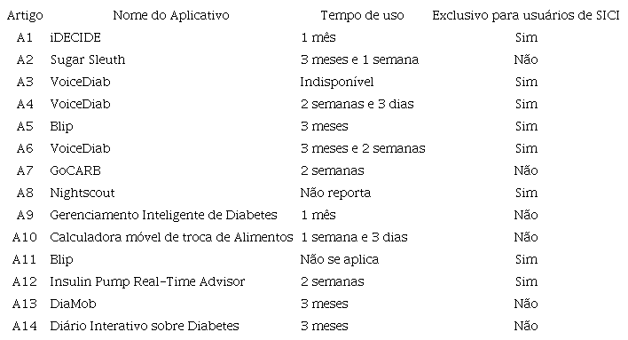 Incluíram-se na análise final 14 estudos, com amostra total de 1.090 pessoas com DM1 e 30 cuidadores infantis. Os estudos tiveram como objetivo identificar a influência de aplicativos móveis na autogestão do DM1. Os participantes que utilizaram aplicativos móveis para autogestão do diabetes foram crianças, adolescentes e adultos. A maioria dos estudos dos estudos classificou-se como observacional, nível IV de evidência (n=9). Houve predomínio de pessoas em uso de SICI, conforme quadro 2.