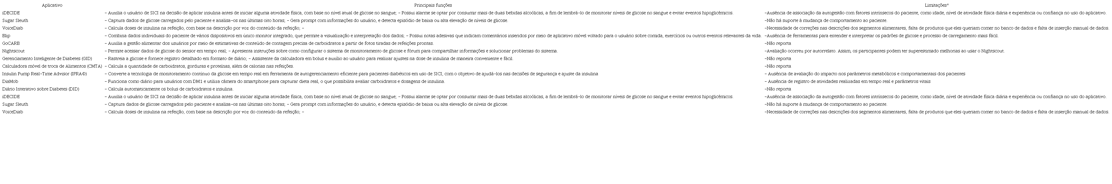 Tais aplicativos apresentaram variadas funções, como auxiliar usuários de SICI na decisão de aplicar insulina, capturar e analisar dados de glicose, calcular doses de insulina na refeição, auxiliar gestão alimentar, calcular a quantidade de carboidratos, gorduras, proteínas e calorias nas refeições, monitoramento contínuo da glicose e calcular automaticamente bolus de carboidratos e insulina.