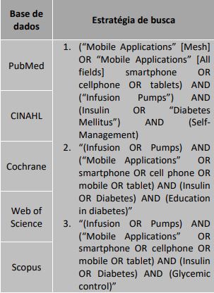 Considerou-se como critério de inclusão artigos científicos originais, que abordassem sobre aplicativos móveis para autogestão do DM1 em usuários de SICI, sem restrição temporal, nos idiomas português, inglês e espanhol. Excluíram-se os estudos indisponíveis.