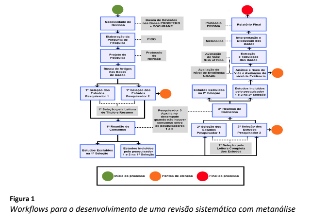 Para a realização de uma revisão sistemática, se faz necessário, a formulação de um protocolo muito bem alinhado em suas partes (Workflows - figura1). Essas, consistem na formulação da pergunta de pesquisa, no registro do protocolo, determinação dos critérios de elegibilidade, na extração dos dados e na análise dos dados, na avaliação do risco de viés e nas questões éticas.10,11