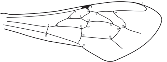 All sampled specimens were stored in ethanol at -20 °C. Later, the forewings of both right and left sides of each individual were removed, with the help of entomological forceps. Subsequently, these structures were placed between two microscopic slides, to keep them flat and prevent distortion, during the image capture process. The images were acquired and digitized with a camera attached to a stereomicroscope using the Leica Application Suite version 3.4.1. From the images of the wings, coordinates of the landmarks were obtained on both sides using software Tps-