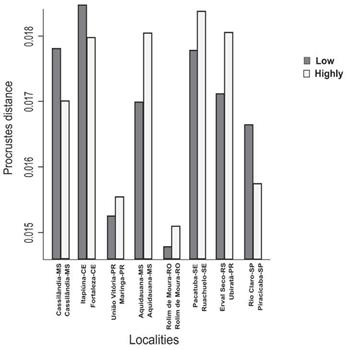 On the other hand, the effects of ANOVA, on the wing-shape asymmetry, showed significant results in all populations, regardless of where the samples were obtained and whether they presented a high or low level of disturbance. This result demonstrated the existence of fluctuating asymmetry in all populations of A. mellifera, when wing shape was evaluated. From the interaction analysis performed, to verify the presence of FA and to compare the populations analyzed, we observed that colonies collected close to where insecticide application occurs, such as Maringa-PR, Riachuelo-SE and Ubirata-PR, presented a greater asymmetry value, when compared to localities with low levels of human disturbance (Fig. 2). Furthermore, we found that samples collected from locations, classified with a high degree of human disturbance, such as Aquidauna-MS and Rolim de Moura-RO, also showed a higher degree of asymmetry, compared to the colonies sampled in environments with a low degree of human disturbance. Thus, from all 16 locations sampled, 63 % of the colonies collected in contaminated environments, showed greater asymmetry when compared to others. Significant differences (P < 0.05) were observed when FA was regarded as the environmental response and high and low impacted areas were considered a fixed factor. The only samples that observed a higher value of FA, were those populations located in areas considered with low levels of human disturbance, such as Cassilandia-MS, Itapiuna-CE and Rio Claro-SP. With regards to wing shape heritability, a value of h2 = 0.33 with EPM standard error = 0.0008 was found.