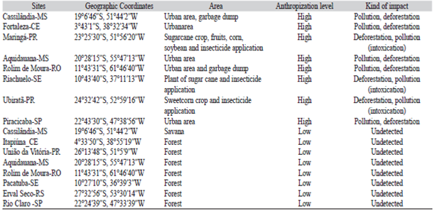 The environment was chosen in a way to maximize the degree of conservation and anthropization. Regarding the classification of places with high and low degree of human disturbance, environments considered highly anthropogenic were chosen for major urban, farming areas with insecticide applications, and industries with large areas (regions with high pollution rates). On the other hand, environments considered with low levels of human disturbance were chosen because they are areas of permanent preservation of remaining forests (Atlantic Forest, Planalto, Cerrado), riparian areas or ecological reserves (Table 1).