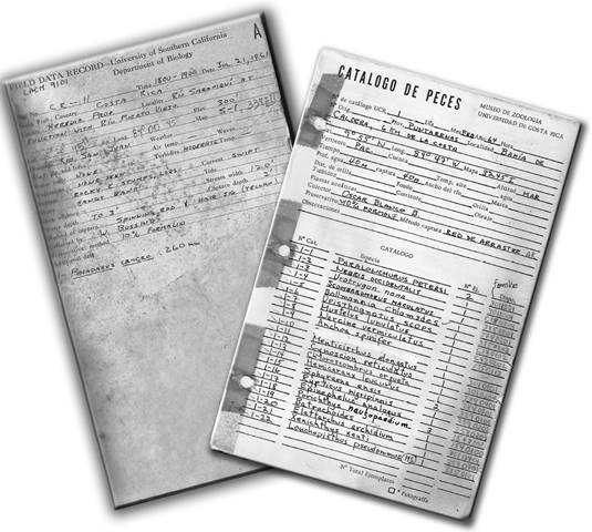 Izquierda. Primera página de la libreta de campo de William A. Bussing. Muestra tomada el 21 de julio de 1961 donde se unen el Río Sarapiquí con el Río Puerto Viejo, Heredia, Costa Rica.(First page of the fieldnotes by William A. Bussing. Sample taken on July 21 1961 at the juntion of the Sarapiquí and Puerto Viejo rivers, Heredia, Costa Rica.). Derecha. Primera página del catálogo de Ictiología del Museo de Zoología de la Universidad de Costa Rica, que data de febrero 1964. (First page of the Ichthyology Catalogue of the Zoology Museum, University of Costa Rica, from February 1964).
