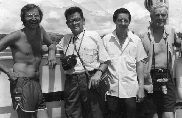 Robert Lavenberg, Clark Hubbs, William Bussing y otra persona no reconocida en el Golfo de Nicoya, Costa Rica en junio 1973. Participantes de la Reunión 53 de la Sociedad Americana de Ictiólogos y Herpetólogos realizada en la Universidad de Costa Rica a partir del 19 de junio de 1973. Fotógrafo desconocido.(Robert Lavenberg, Clark Hubbs , William Bussing and unrecognized person; fieldtrip to the Gulf of Nicoya, Costa Rica in June 1973. Participants of the Meeting of the American Society of Ichthyologists and Herpetologists, at the University of Costa Rica, starting on June 19, 1973. Unknown photographer.)