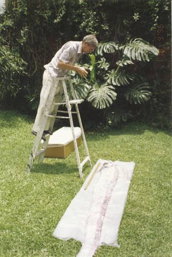 William Bussing fotografiando un Regalecus, en el jardín de su casa en San Pedro, Costa Rica. Fotografía por Myrna I. López.(William Bussing photographing a Regalecus, at his house backyard in San Pedro, Costa Rica. Photograph by Myrna I. López).