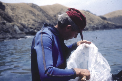 Don William revisando la colecta en las Islas Murciélago, Área de Conservación Guanacaste, Costa Rica. Abril de 1996. Fotografía por Jorge Cortés. (Don William checking his collection at Islas Murciélago, Guanacaste Conservation Area, Costa Rica. April 1996. Photograph by Jorge Cortés.