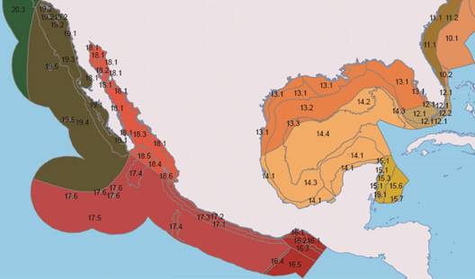 Costa Occidental del Golfo de México (de Tamaulipas a Tabasco) [14.1.1, 14.1.2, 13.1.5, 14.3]: La costa sur del golfo tiene una plataforma compuesta de un sustrato calcáreo somero, es considerablemente estrecha hacia la parte occidental (Solís et al., 2013). El fondo del Golfo Sur está formado por una mezcla de arenas calcáreas, limo y arcilla, principalmente (Pica, Ponce y Barrón, 1991; Wilkinson et al., 2010). En esta región habitan clypeasteroides (Clypeaster, Encope y Mellita) y spatangoides(Schizasteridae, Brissidae y Spatangidae).