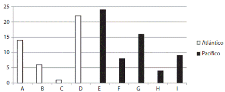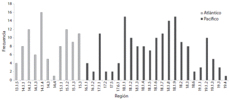 Al terminar la construcción de las matrices de datos, el análisis de la costa Atlántica incluyó 11 regiones y 29 especies, mientras que el de costa Pacífica incluyó 23 regiones y 39 especies.