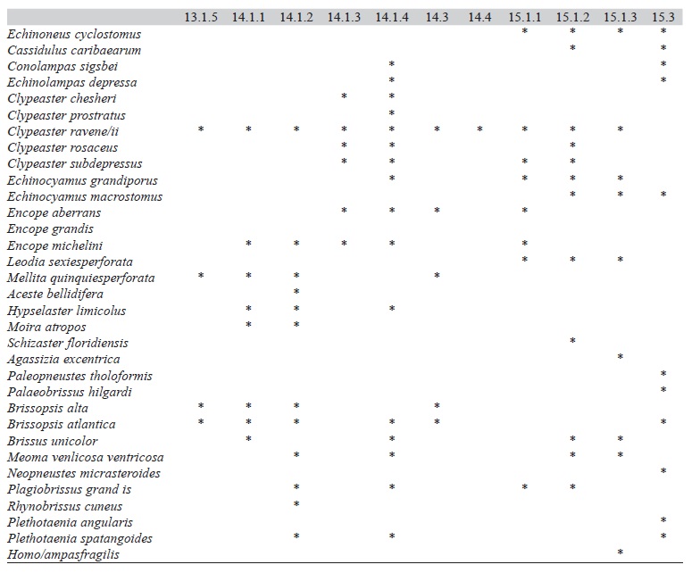 Al comparar con el reporte previo para el Caribe Mexicano (Laguarda et al., 2005), en este trabajo se aumentan los reportes de Conolampas sigsbei, Agassizia excentrica, Schizaster floridiensis, Paleobrissus hilgardi, Echinocyamus macrostomus, Plethotaenia spatangoides, Neopneustes micrasteroides, Palaeopneustes tholoformis, Homolampas fragilis y Plethotaenia angularis para la biorregión D: Zona nerítica y talud del Caribe mesoamericano.