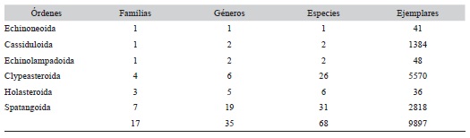 Se revisaron 9 897 ejemplares pertenecientes a 68 especies, 35 géneros, 17 familias y seis órdenes de equinoideos irregulares recolectados en aguas mexicanas (Cuadro 3); los órdenes más diversos fueron Spatangoida (31 especies), Clypeasteroida (26 especies) y Holasteroida (6 especies). De las 68 especies reportadas, 37 se distribuyen en el Océano Pacífico y 31 en el Océano Atlántico (Tabla 3), ninguna de ellas se encontró en ambas costas.