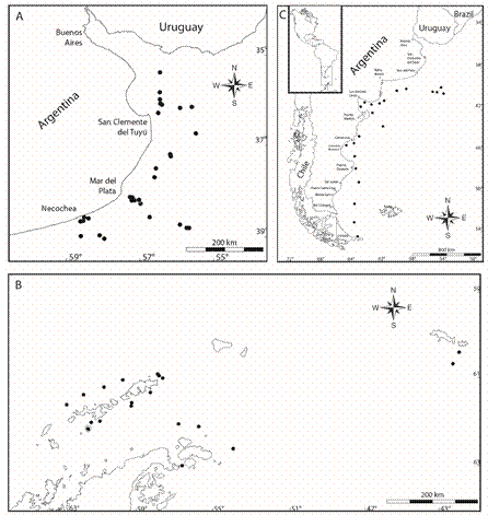 The study was conducted in the Southwestern Atlantic Ocean, along the coast of Argentina. Three campaigns were performed: Mejillón II (hereafter M-II; Fig. 1 A), Summer Antarctic Campaign 2011 (CAV-III; Fig. 1 B) and the final stretch of the Summer Antarctic Campaign 2011 (CAV-IV; Fig. 1 C). M-II was conducted from 35º S to 39º S, between 10 and 140 m depth (31 stations) from September 9th to September 20th 2009. CAV-III took place around the Antarctic Peninsula, South Shetland and South Orkney Islands, covering 67-754 m depth (21 stations) from March 15th to March 27th 2011. CAV-IV corresponds to the final part of the Summer Antarctic Campaign conducted between 39º S and 55º S, at 30-140 m depth (22 stations) from March 15th to March 27th 2011. Samples were taken using fishing net and a dredge trawl. All samples were sorted, identified to the lowest taxonomic level possible and stored in 96 % ethanol. For each station the presence of each echinoderm class was analyzed, and the proportions were represented.