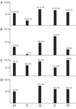 A total of 74 stations were analyzed in this work, of which in 68 was found at least one echinoderm individual (92 %). The total number of stations where each class appeared was: Asteroidea 50 (68 %), Echinoidea 47 (64 %), Ophiuroidea 41 (55 %), Holothuroidea 38 (51 %) and Crinoidea 15 (20 %) (Fig. 2 A).