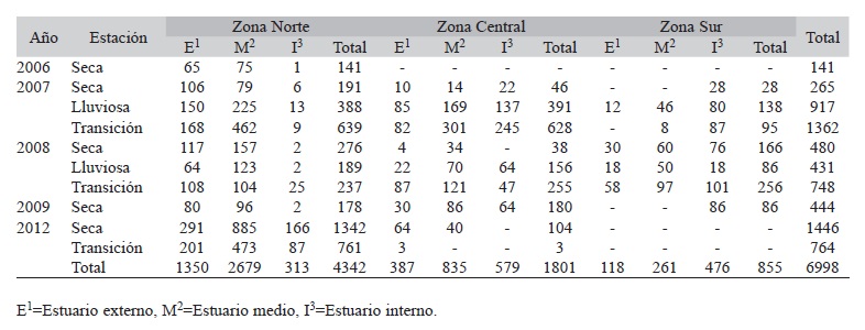 Los datos analizados corresponden a las mediciones de salinidad realizadas por el ICE en el sector estuarino del HNTS entre el periodo 2006-2012. El trabajo se realizó en 15 estaciones de muestreo fijas y 90 estaciones alternas con una separación de 500m sobre los canales y esteros principales del HNTS, lo anterior con el objetivo de cubrir sectores representativos del área de estudio durante los principales periodos de precipitación a lo largo del año: estación seca (diciembre-abril), transición (mayo-agosto) y lluviosa (setiembrenoviembre). En total se realizaron 6 998 mediciones de salinidad, 2 842 correspondientes a la marea alta y 4 156 mediciones durante la marea baja, en el Cuadro 1 se muestra el número de mediciones realizadas en cada periodo y zona del estuario (interno, medio, externo). En cada sitio de medición se estableció una sección transversal entre los márgenes del cauce del río, estero o canal del estuario, en esta sección se realizaron mediciones en tres puntos, uno en la parte central del cauce, otro en la margen derecha y otro en la margen izquierda, en cada uno se midió el valor de salinidad en la superficie (<50cm de profundidad) y en el fondo el cual dependía de la profundidad máxima del sitio. Las mediciones corresponden a unidades prácticas de salinidad (ups) mediante una sonda multiparámetros marca YSI modelo 556 MPS. Cuando se encontró una diferencia marcada entre la salinidad del fondo y la superficial, mayor a 10 ups, se realizó un perfil vertical con mediciones cada 50cm de profundidad, esto fue realizado en los sitios donde hay un encuentro de las masas de agua dulce y salada, conocidos popularmente por los pescadores como golpes o topes de agua marina y dulce. Los datos fueron analizados utilizando herramientas exploratorias multivariables como el análisis de conglomerados y escalamiento multidimensional, además se realizaron análisis de varianzas para comprobar diferencias en la salinidad entre épocas, sitios y mareas; para realizar estos análisis se utilizaron los paquetes estadísticos Systat® 10, Statistica® 6 y PAST® (Clarke & Warwick, 1994; Krebs, 1994; Zar, 1999; Hammer, Harper & Ryan, 2001; Pla & Matteucci, 2001).