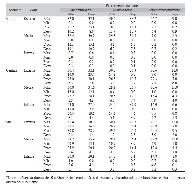 En este periodo los caudales promedio mensuales registrados en el Río Grande de Térraba variaron entre 60 y 230m3/s, el caudal promedio de este periodo fue cercano a los 115m3/s (Fig. 2). Durante las mareas altas en la zona norte, la cual se encuentra bajo la influencia directa del Río Grande de Térraba, el valor promedio de salinidad en el fondo y superficie fue de 14ups±11ups, lo cual reflejó una alta variabilidad de valores de salinidad en este zona, mientras que la zona central, que comprende los esteros y desembocaduras de Zacate y Guarumal, presentó valores promedio de 25ups±3-5ups, indicando una mayor estabilidad e influencia marina en los valores de salinidad. Por su parte en el extremo sur, que corresponde al estero Sierpe, los valores promedio correspondieron a 17ups±10ups en superficie y fondo, mostrando un leve descenso con respecto a la zona central y el cual se puede atribuir a los aportes de agua dulce del Río Sierpe (Fig. 3A, B, Cuadro 2).