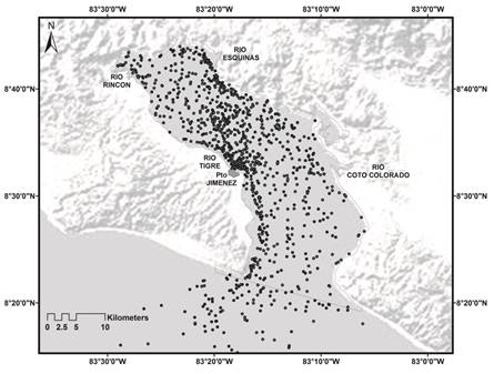 Las agregaciones de alimentación fueron observadas dentro de la cuenca interna de Golfo Dulce, específicamente sobre la costa occidental en un área que abarcaba 23km desde la desembocadura del Río Tigre hasta la desembocadura del Río Rincón, a una distancia aproximada de la costa de entre 100 a 1 000m y una profundidad entre las isobatas de 5 a 100m (Fig. 2). Dichas agregaciones se presentaron en la zona de influencia de los ríos Tigre y Rincón sobre o cerca de la corriente que produce la desembocadura de estos ríos. (Fig. 2).
