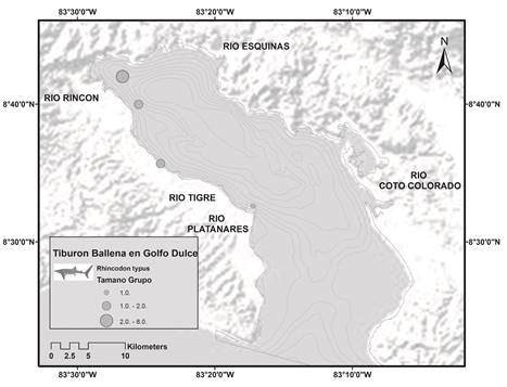 Los datos colectados consisten en cuatro avistamientos incidentales de agregaciones de alimentación del tiburón ballena, realizados durante una investigación a largo plazo con cetáceos (2005-2013) en un total de 520 salidas y 2 800h de muestreo efectivo, llevado a cabo en Golfo Dulce, en donde cada 30min se tomo la posición geográfica, junto a la condición del mar (escala Beaufort), temperatura, ciclo de mareas, así como hora, estructura y tamaño del grupo, comportamiento, descripción detallada del sitio y se intentó identificar en el área el grupo taxonómico del cual se estaban alimentando los animales. Lo anteriormente descrito permitió a su vez un registro del esfuerzo en campo (Fig. 1). La estimación de la talla de los individuos se realizó comparando al tiburón con un objeto de tamaño conocido embarcación de 7m de eslora, esta información fue corroborada mediante fotografías y videos (Rowat et al., 2007; Hobbs et al., 2009). La madurez sexual de los individuos se determinó mediante la talla, ya que individuos menores a 9m son considerados juveniles, mientras que los mayores como adultos (Colman, 1997; Stevens, 2007; Hobbs et al., 2009). Cada evento fue documentado por medios de fotografías y videos submarinos.
