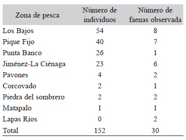 En las descargas en centros de acopio se encontraron un total de 163 tiburones martillo, mientras que durante los viajes de observación abordo se capturaron 152. En cuanto a los viajes de observación abordo, las mayores cantidades de tiburones se capturaron en las zonas de pesca conocidas como Los Bajos, Pique Fijo y Punta Banco, mientras que las menores cantidades se registraron en Corcovado, en la Piedra del Sombrero y en Matapalo (Fig. 1, Cuadro 1).