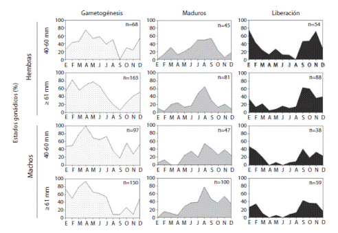 La liberación de gametos se presentó todo el año en individuos de ambos sexos y ambas tallas. Las hembras de tallas 40-60 mm presentaron dos picos mayores al 70 % en noviembre y enero, y en las ≥ 61 mm el pico fue de 60 % en septiembre-octubre. Los machos con tallas de 40-60 mm, presentaron dos picos, uno de 48 % en enero y otro de 42 % en septiembre. Un patrón similar se presentó para los machos con tallas ≥ 61 mm.