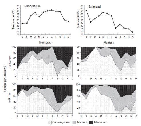En las hembras de 40-60 mm, de enero a abril, la gametogénesis va en aumento, con un pico de 75 % en abril, disminuyendo hasta septiembre donde la gametogénesis no se presentó. Un segundo pico de 55 % se observó en diciembre. Mientras que en las hembras ≥ 61 mm la gametogénesis es alta, de 70 %, de enero a junio disminuyó a 6 % en septiembre para aumentar nuevamente a partir de octubre.