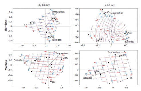 Umbrales de temperatura y salinidad: La figura 3 muestra el análisis de escalamiento multidimensional no métrico, entre la temperatura y salinidad para cada uno de los estadios de madurez gonádica tanto para hembras como para machos y para los dos rangos de tallas y la figura 4 resume la temperatura y salinidad umbrales para cada estadio reproductivo. Se observó que las hembras de 40-60 mm requieren 26 °C y 32 UPS para iniciar la gametogénesis. Mientras las de ≥ 61 mm, la inician en 25 ºC en el mismo rango de salinidad. Para alcanzar el estadio maduro las de 40-60 mm requieren 29 °C y 26 UPS, mientras que las de ≥ 61 mm necesitan de 30 ºC y 25 UPS. La liberación de ovocitos en las hembras de 40-60 mm se inició a 24 ºC y 28 UPS, y para las de ≥ 61 mm a 28 ºC y a 25 UPS.