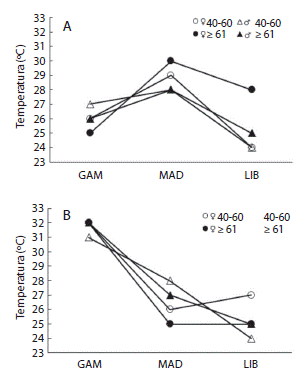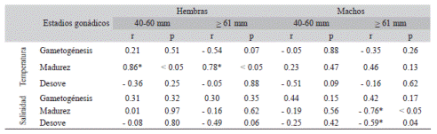Correlación entre la temperatura, la salinidad y los estadios de madurez gonádica . La temperatura media anual del agua fue de 26.9 ± 3.4 °C durante el periodo de muestreo, oscilando entre 22 y 30 °C (Fig. 2). Resulta interesante señalar que la temperatura solo afectó de manera significativa a las hembras maduras, y para ambas tallas. En cambio, los machos no presentaron ninguna correlación de los estadios reproductivos con la temperatura (Cuadro 2).