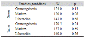 Como los datos con los que se trabajó no cumplieron con los supuestos de normalidad, se realizó la prueba de Wilcoxon entre las frecuencias de los estadios del ciclo gonádico para hembras y para machos, y para ambos rangos de tallas analizados. Asimismo, se realizaron pruebas de correlación de Spearman para determinar la relación entre los estadios de madurez gonádica de las hembras y de los machos y en sus dos rangos de tallas con las variables ambientales. Por último, se hizo un escalamiento multidimensional no métrico (NMDS) con ajustes del modelo lineal generalizado entre los tres estadios gonádicos de las hembras, de los machos y para los dos rangos de tallas con la temperatura y la salinidad.