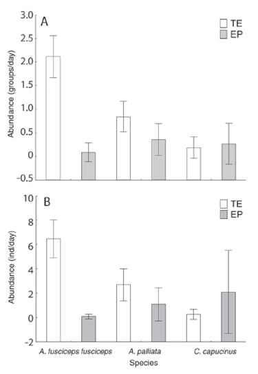 Primate abundance: TE showed significantly higher primate abundance than EP in terms of groups seen per day (3.07 ± 1.29 groups/day in TE and 0.7 ± 1.19 groups/day in EP, Z = 3.82, P = 0.0001) and individuals per day (9.4 ± 5.1 ind. / day in TE and 3.2 ± 6.9 ind. / day in EP, Z = 3.15, P = 0.0015 for individuals). In TE, spider monkeys and howler monkeys were the most abundant species (2.15 ± 1.08 and 0.76 ± 0.76 groups per day, respectively) and detected more often than at EP (0.36 ± 0.5 howler groups per day, spider monkeys at an average of 0.09 ± 0.3 groups per day) (Fig. 1A). In contrast, capuchins were more common at EP (0.27 ± 0.64 groups / day) than at TE (0.15 ± 0.54 groups per day). The daily encounter rates for individuals at TE parallels the pattern for groups detected, with average values of 6.4 ± 6.8 ind./day for spider monkeys, 2.6 ± 3.2 ind. / day for howlers, and 0.26 ± 1.04 ind./day for capuchins. The opposite pattern was seen in EP, where the daily average of capuchins encountered was highest (2.09 ± 5.06 ind./day), followed by howlers (1.09 ± 2.02 ind./day), then spider monkeys (0.09 ± 0.3 ind./day) (Fig. 1B). Comparison of species abundance estimates between sites revealed a significant difference only for the spider monkey (Z = 4.45, P ˂ 0.0001 for groups and Z = 4.53, P = 0.0001 for individuals). There were no significant difference in abundance between sites for howlers (Z = 1.34, P = 0.17 for groups, and Z = 1.34, P = 0.17 for individuals), or for capuchins (Z = ˗0.46, P = 0.64 for groups, and Z = ˗0.56, P = 0.57 for individuals). Within TE there were significant differences in abundance of species measured both as groups (H = 39.66, P ˂ 0.0001) and of individuals (H = 41.2, P ˂ 0.0001). At EP there was no significant difference in abundance between species (H = 2.24, P = 0.32 for groups and H = 2.24, P = 0.32 for individuals). Subsequent analysis of abundance at the TE site, using the Newman-Keuls test, confirmed that there were significant differences between all species.