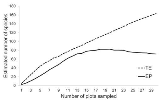 Forest regeneration and dispersal syndromes: We collected 68 plant species in TE and 32 in EP. The most abundant species at TE were Chrysochlamys membranacea (Clusiaceae), Pourouma minor (Cecropiaceae) and Pseudolmedia rigida (Moraceae). Tetragastris varians (Burseraceae) and Ossaea sp. (Melastomataceae) were most abundant in EP. There were 22 species exclusive to TE and 9 to EP. The average number of species per square meter was 3 ± 1.46 in TE and 1.6 ± 1.47 in EP. There were a total of 113 plants in the TE sample and 56 in EP. Total plant density per square meter was 3.8 ± 1.9 in TE, and 1.9 ± 2.15 in EP. At EP 73 % of plots had two or fewer plants, resulting in a standard deviation greater than the mean. The difference in species richness and density between sites was highly significant (Z = 3.72, P = 0.0001 for richness; Z = 4.05, P ˂ 0.0001 for density). Species accumulation curves, estimated using the non-parametric Chao1 index, showed that the TE curve did not stabilize with accumulated number of species two times greater than that at EP, where the curve did stabilize. Total species estimates for the sites were 163.33 ± 41.37 species in TE and 71.61 ± 24.22 species in EP (Fig. 2).
