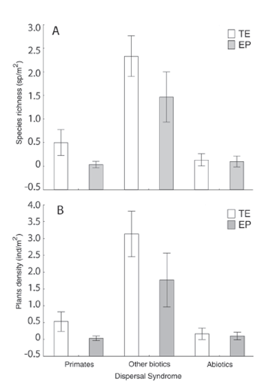 Higher species richness and density for saplings in understory at TE is not conclusive evidence of a causal relationship between these characteristics and greater primate abundance. The observed pattern could conceivably be due to other factors that are important at a small scale, such as topography, edaphic characteristics, and light conditions. However, the apparent structural similarity between localities implies that primate seed dispersal may indeed be the critical variable resulting in diminished forest regeneration in EP.
