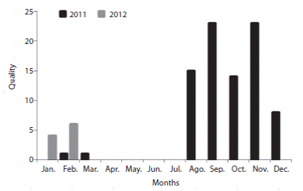 Biological aspects: in 2011, 87 adults were collected with the light trap in February, March, August, September, October, November and December. In 2012, 10 adults were collected in January and February (Fig.1). In August and September, temperature and humidity increased in the field and adults began to be collected.